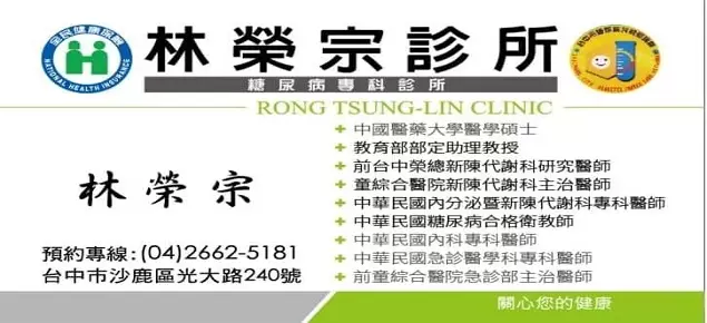 林榮宗診所位於台中市沙鹿區,在地深耕多年時間是一家優良診所,擁有專業的醫師團隊與糖尿病衛教師跟營養師、護理師,林醫師秉持【專業、細心、親切】的問診,針對糖尿病、高血壓、高血脂、一般內科、新陳代謝及內分泌疾病等等的患者,提供高品質的醫療服務,帶給病患及家屬最好的醫療環境,林醫師所帶領的醫護人員始終秉持專業、耐心、熱心的服務精神,獲得患者的信賴與尊敬,這也正是本診所真正想達到的目標。