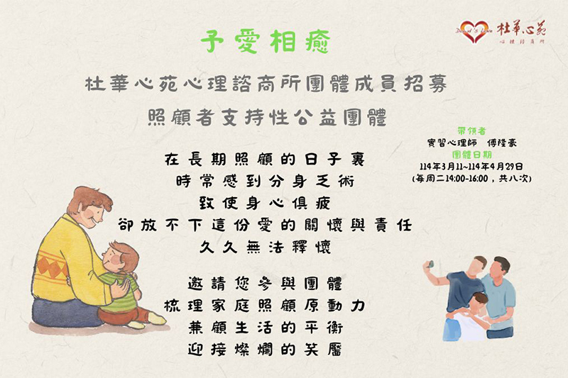 將透過團體諮商形式,協助整理家庭照顧模式,找出其中的阻力與壓力,同時也練習覺察自身狀態,適度抒發情緒,正視個人需求,邁向平衡的家庭生活品質